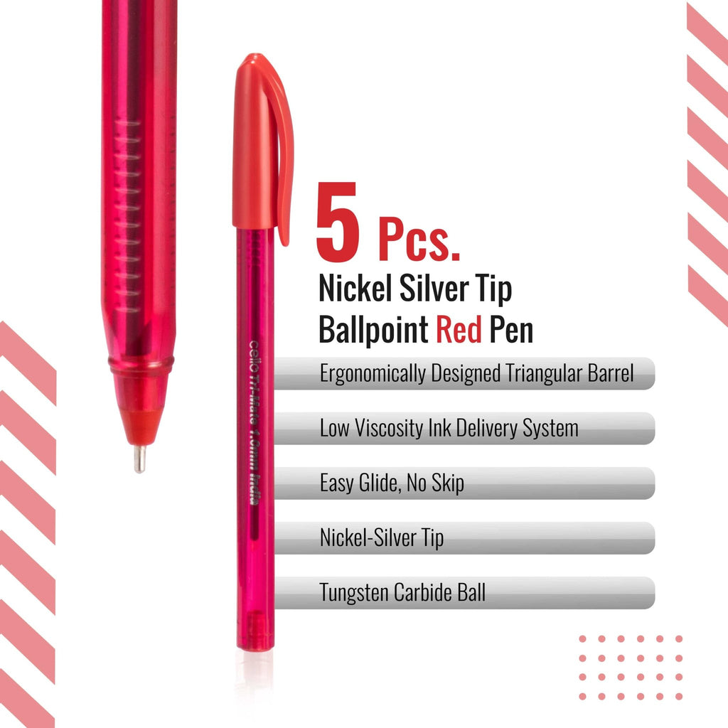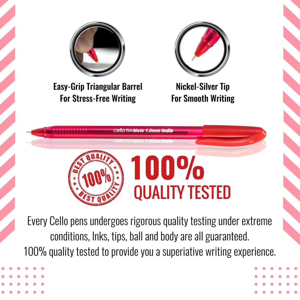 The Cello Tri-Mate Ballpoint Pens are designed for smooth and reliable writing with a 1.0mm medium tip. Compact and easy to carry, these pens come in Black, Blue, and Red ink colours, making them ideal for school, office, or everyday writing needs. The sturdy Tri-Mate grip ensures comfort during extended use.