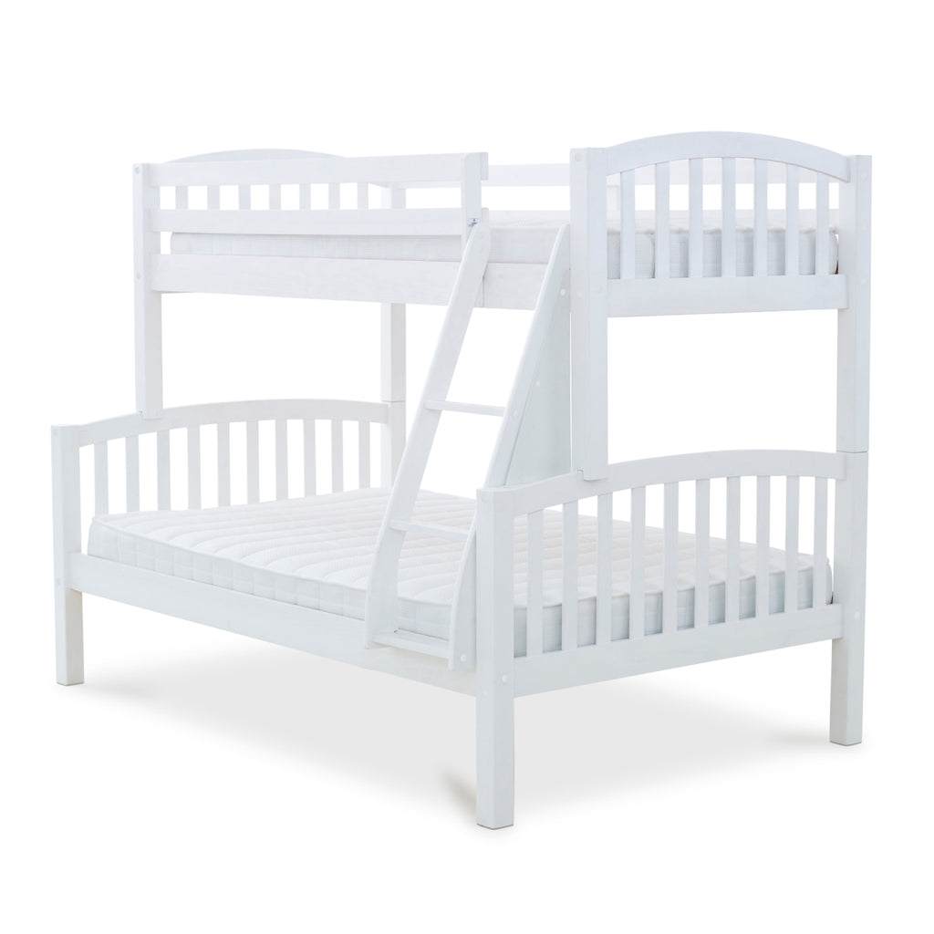 The Mya Triple Sleeper Small Double Bed Frame is a modern bunk bed manufactured using quality Pine and has a finish which helps retain the fine qualities of the pinewood. There are 4 guard rails to the top bunk, 2 to either side which ensures safety for the top bunk sleeper. The headboard and footboard are both styled with vertical slats. This bed can easily be split and used as separate Single and Small Double beds. Mattresses (sold seperately) are supported by a strong wooden slatted base for extra comfort. It is a perfect option for saving space and is ideal for both adults and children.