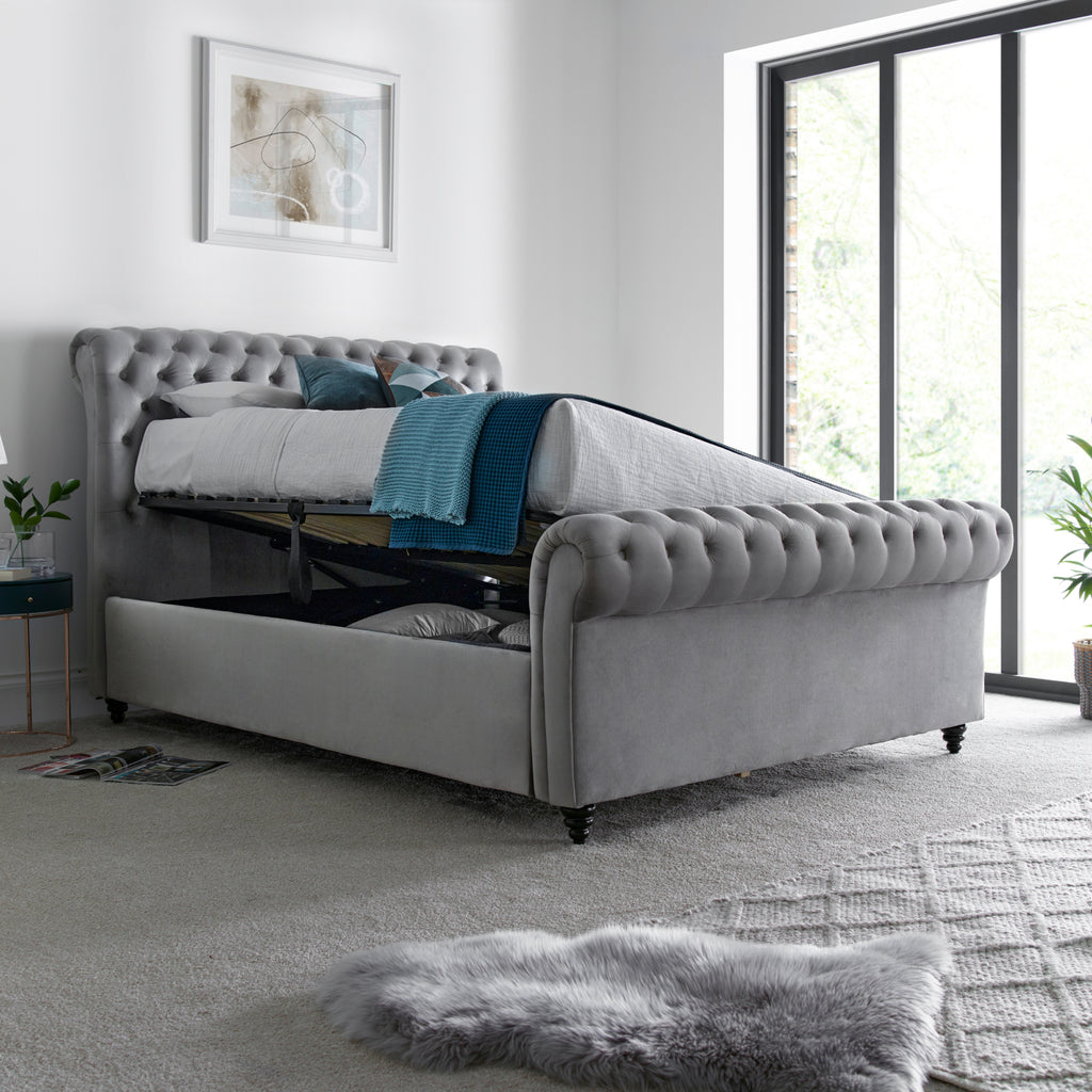 The Osborne is a truly opulent bedframe finished with a beautiful velvet fabric. The solid frame features a stunning rolled and diamond quilted headboard with matching foot end and buttoned details. The sleigh bed is complimented with a side opening ottoman storage for the perfect balance of style and substance. The gas lift arms can be fitted to open from either side of the bed, giving you extra flexibility to fit into any room setting. The frame itself is constructed from high quality materials and uses sprung slats for mattress support. This construction, along with the wooden feet ensures the bed not only looks good but offers great