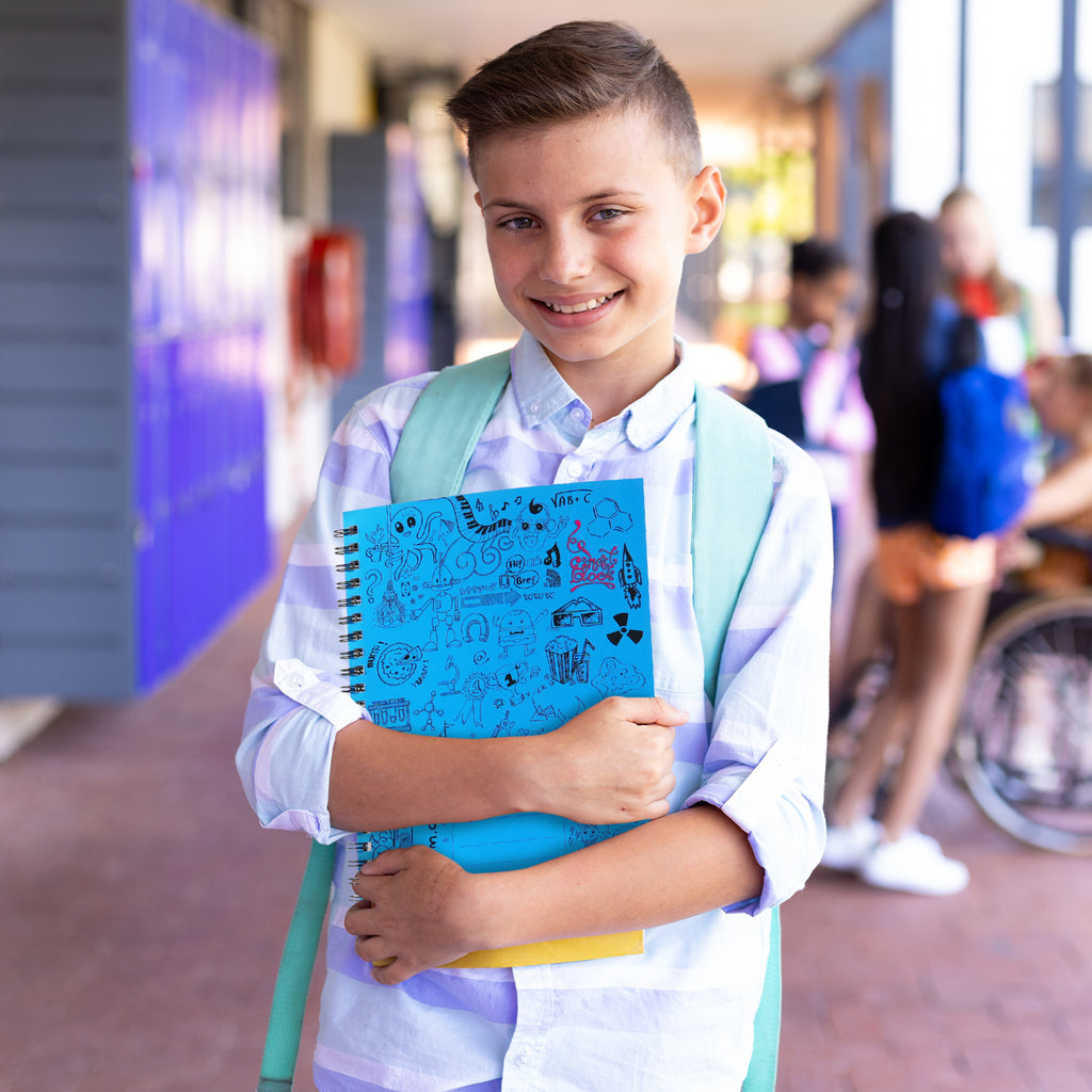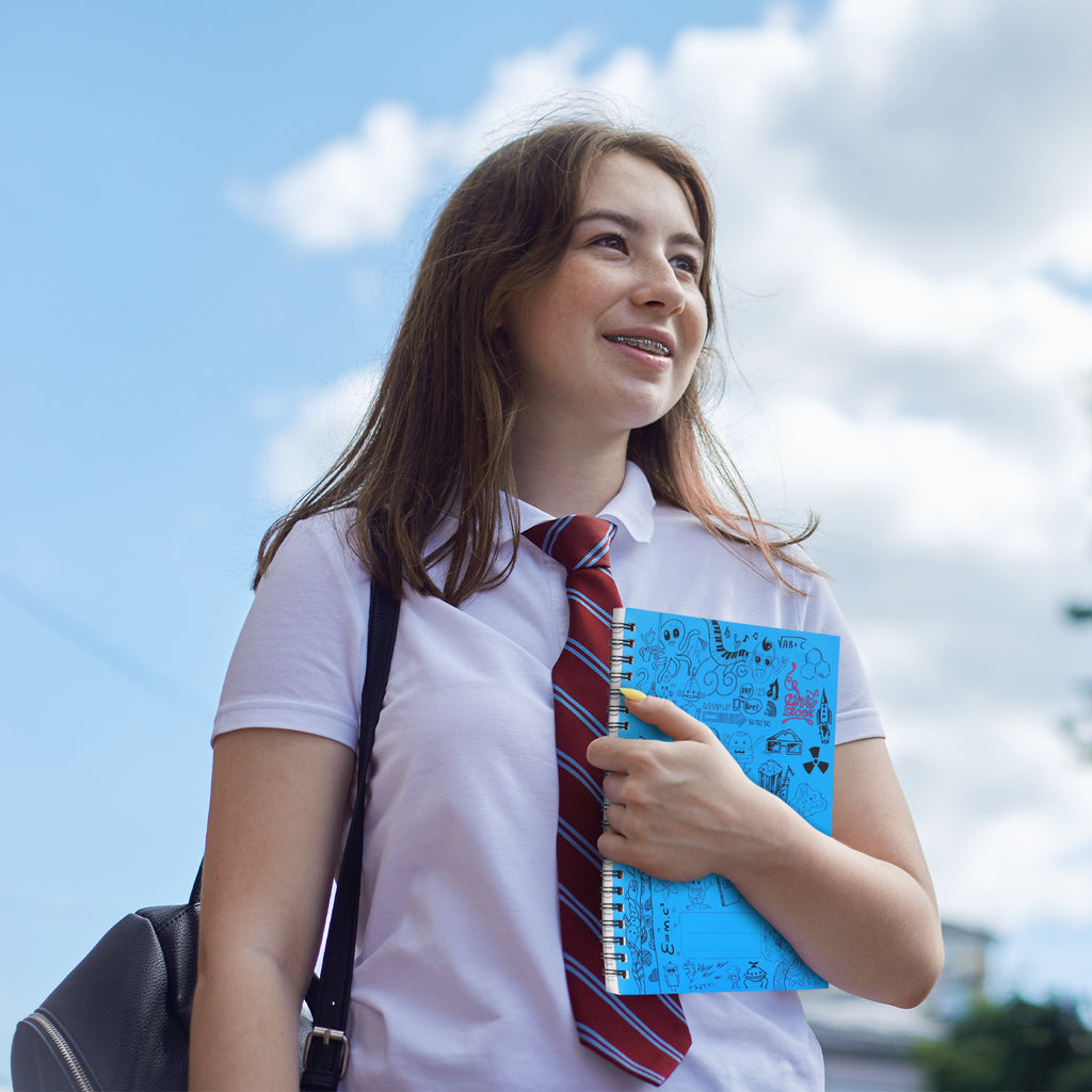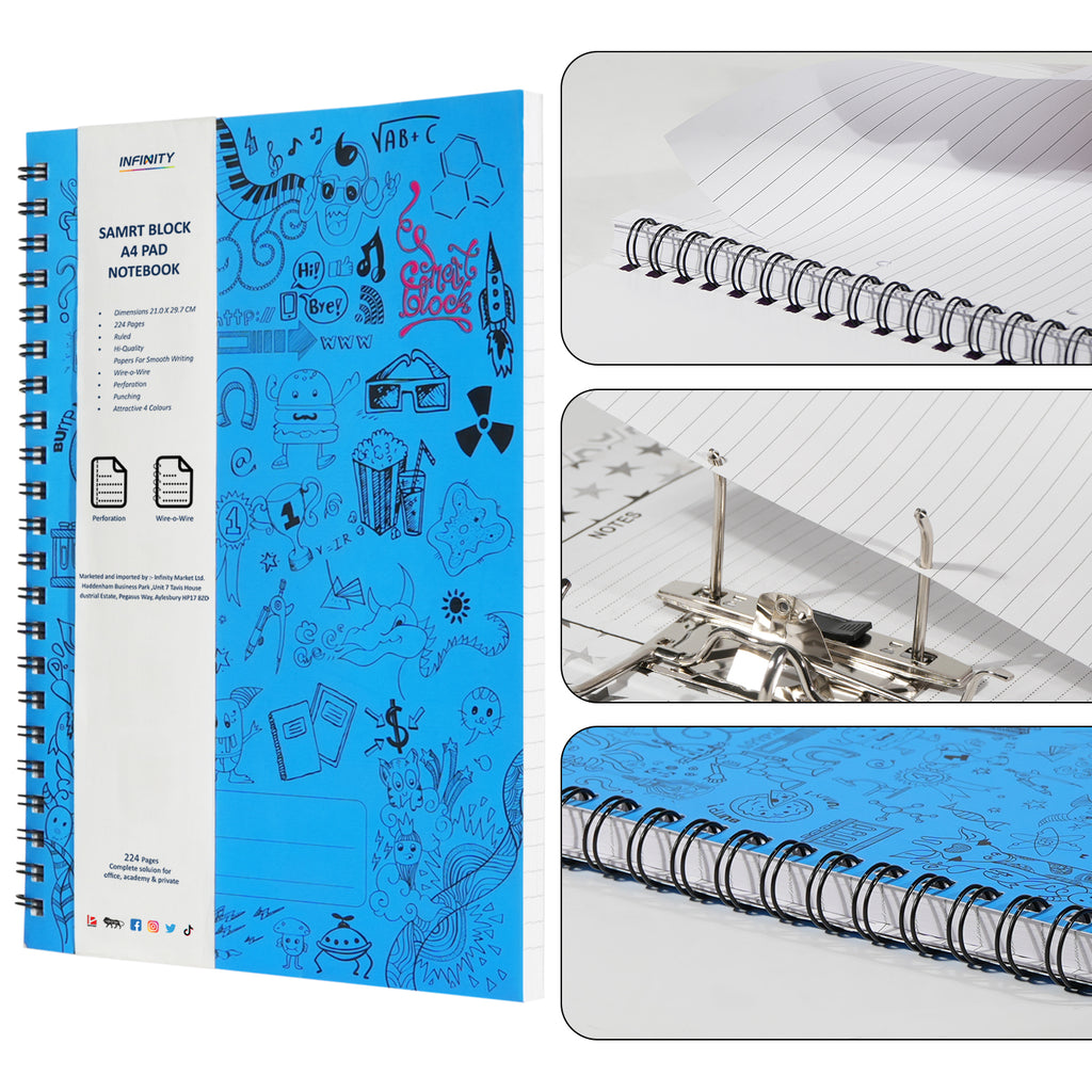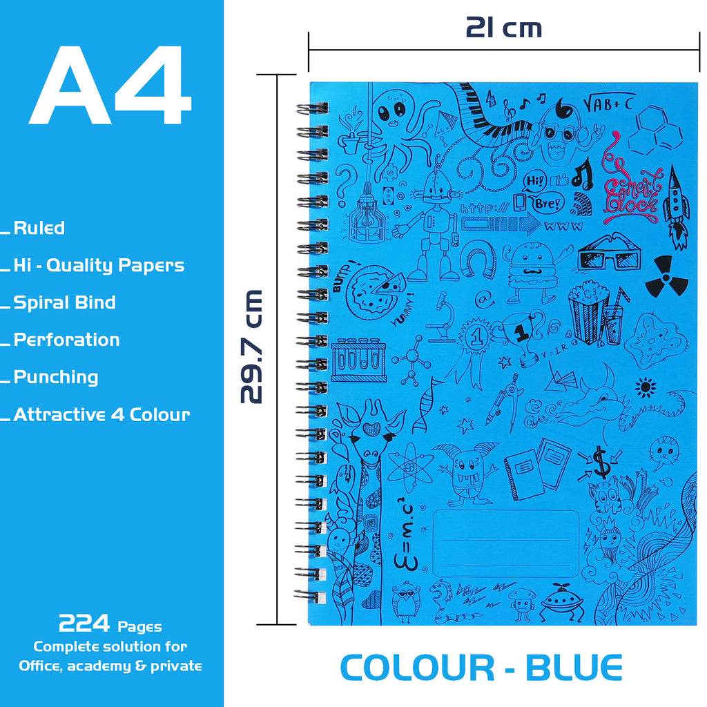The Smart Block Spiral Journal in Blue is available in A4 and A5 sizes, offering 224 ruled pages made from high-quality 80 GSM FSC-certified paper. Designed with a flexible cover and perforated sheets, it provides convenience for school, office, and everyday writing.