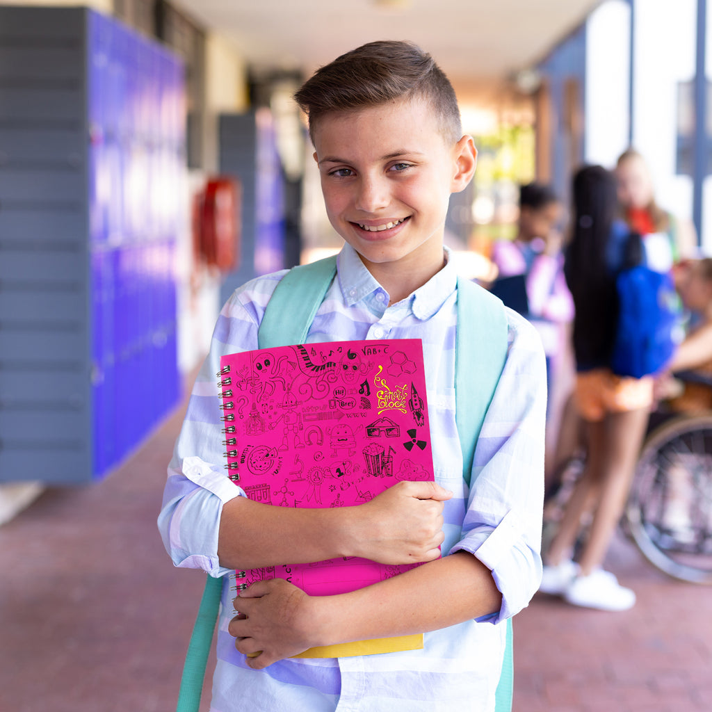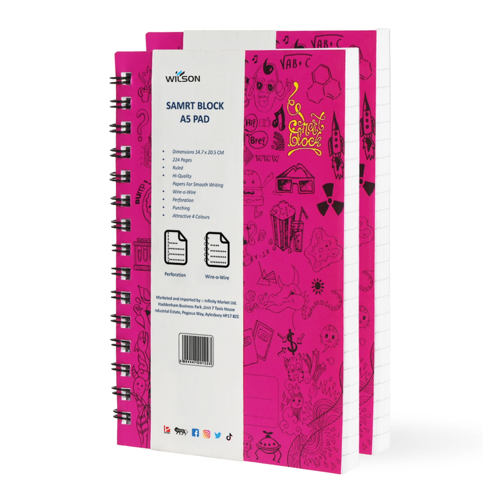 The Smart Block Spiral Journal in Magenta is available in A4 and A5 sizes, each offering 224 ruled pages made from 80 GSM FSC-certified paper. With a flexible cover and perforated sheets, it blends durability, practicality, and style perfect for school, office, or everyday writing.